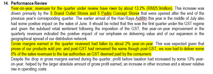 根据季报内容,第四季的业绩主要是受到开斋节的刺激所产生的贡献,再加上去年开张的5间 Brand Outlet 和 5间 Padini Concept Store 做出的贡献。